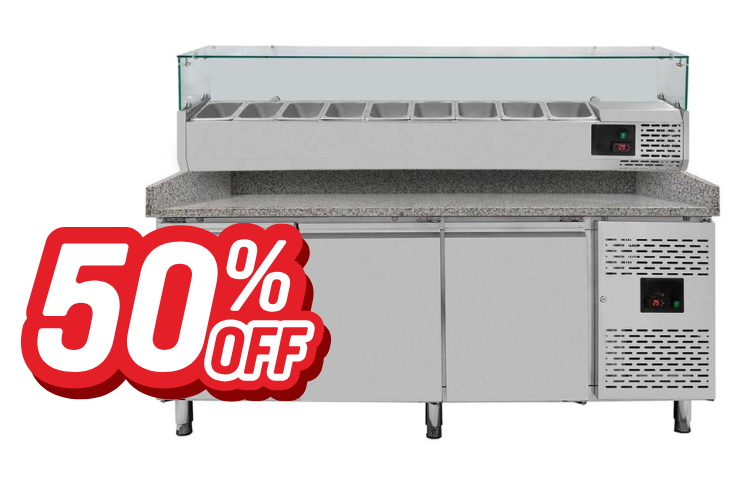 Bereiten Sie Ihre Pizzen professionell und effizient zu – mit dem Pizzakühltisch / 3-türig "grau" inkl. Kühlaufsatz GN1/4. Dieses hochwertige Kühlgerät kombiniert großzügigen Stauraum, präzise Kühlung und eine robuste Arbeitsfläche aus Granit, um Ihre Arbeitsabläufe optimal zu unterstützen.